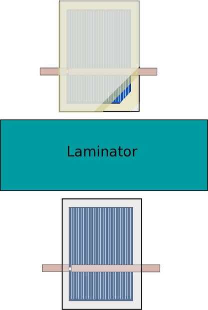 Sin perturbar la posición de la célula solar en la Asamblea, con cuidado colocar el ensamblado en la plastificadora en la dirección indicada.