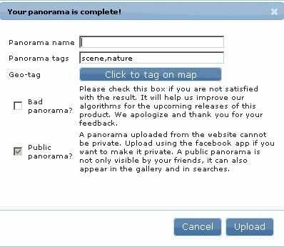 También puedes subir tu panorama en fotos en Dermandar servidor para compartir en la web. Para ello, haga clic en el botón de "Upload", aparecerá otra ventana de diálogo. Usted será capaz de dar un nombre a su panorama y etiqueta con cualquier palabra clave.
