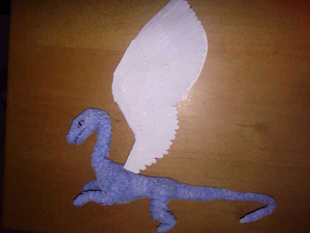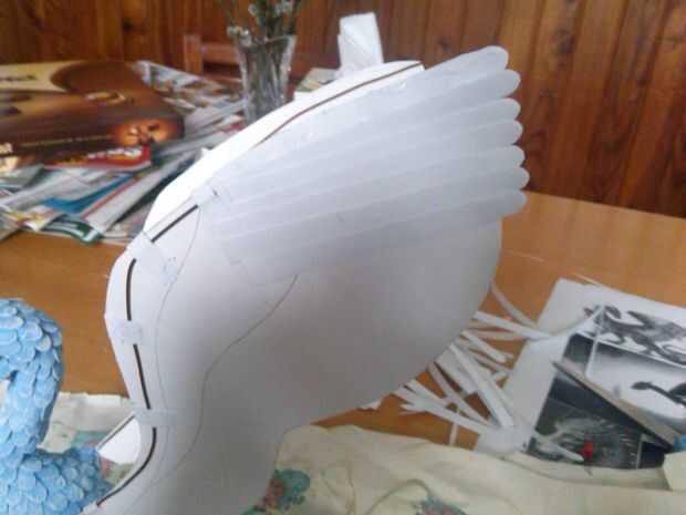 Lo siento sobre eso pero yo primero lo pintó hacia arriba y después de eso hice las alas ahora olvidar la pintura... Primero se corta un pedazo de papel en la forma de las alas. Pegar en los alambres y encubrir con largas escamas (mediante la ampliación de las líneas de corte). Hacer unas filas sobre las alas.