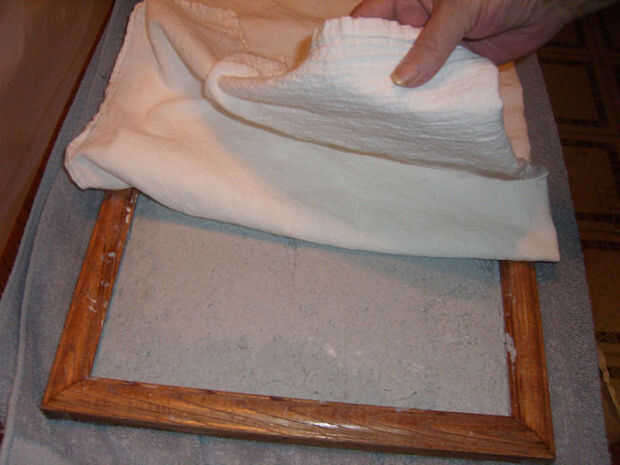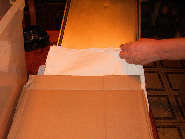Deslizar una bandeja para hornear, tablero firme, etc., entre la toalla blanca baja y la gran toalla de terry, levante el papel y coloque sobre una superficie plana. Coloque un pedazo de cartón en la parte superior.