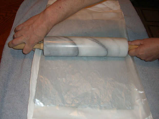 A lo largo sólo tomar su perno de balanceo (utilicé un rodillo de mármol ponderado) y desde el centro hacia su papel de rodillo desde el centro hasta el final. No usar un nuevo movimiento hacia y.