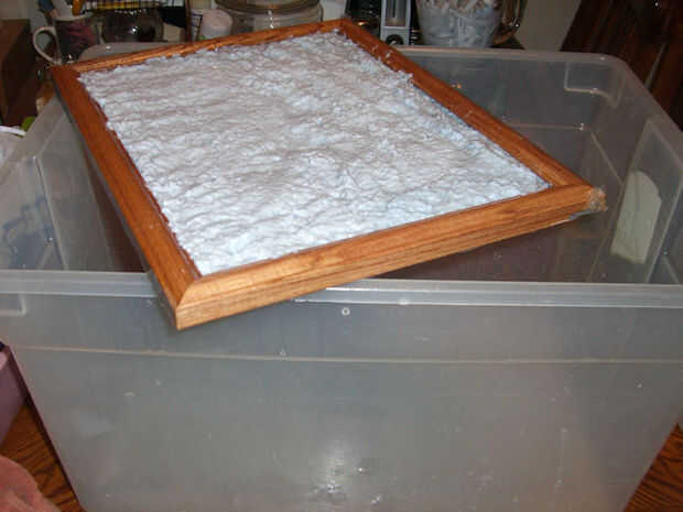 Me gusta poner un pedazo de papel encerado sobre la mezcla y ayuda Presione el agua hacia fuera con una mano arriba y debajo del material de la pantalla para acelerar el proceso.