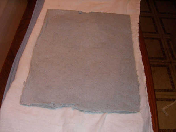 Voltee el marco en la toalla blanca. Retire el marco. Si han manifestado suficiente agua que la mezcla de papel debe caer fuera de la estructura. Si no lo hace, voltearla sobre conseguir una toalla gruesa fresca y repetir el proceso de prensado.