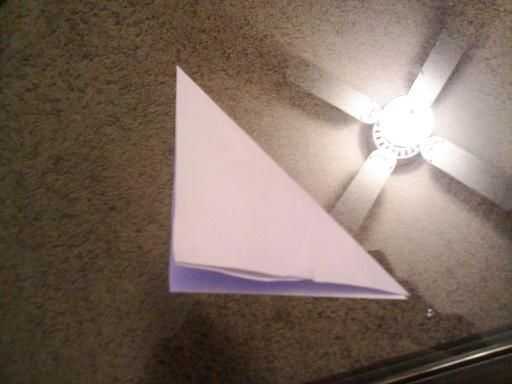 punto de la punta en ángulo de 90 grados en el triángulo hacia abajo. luego tomar la izquierda coner y folf a través y encima por lo que hay es una línea en el centro del triángulo. Esto es difícil de explicar pero mira las fotos para una mejor explicación.