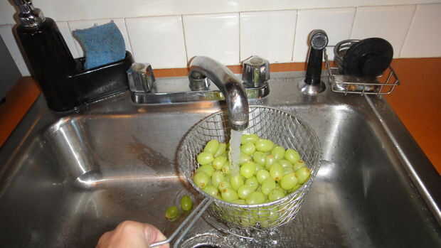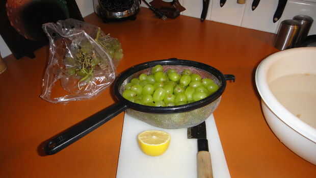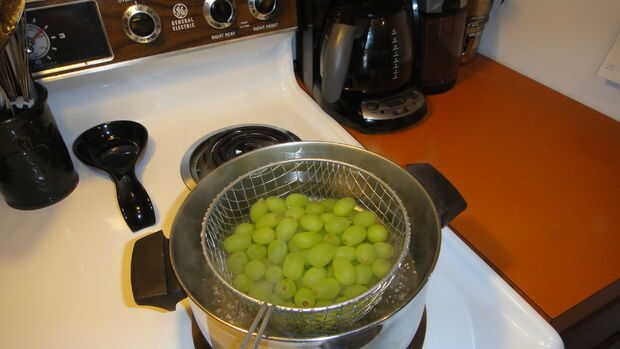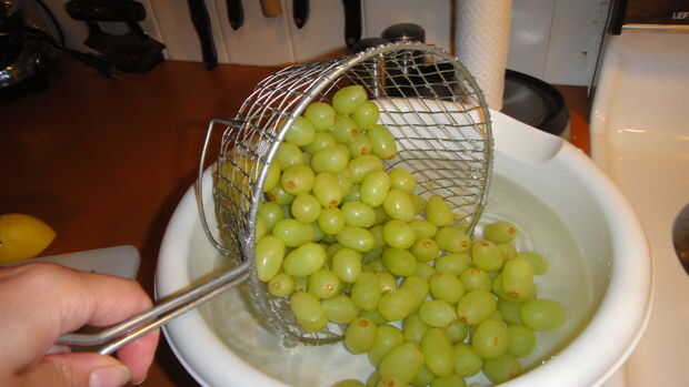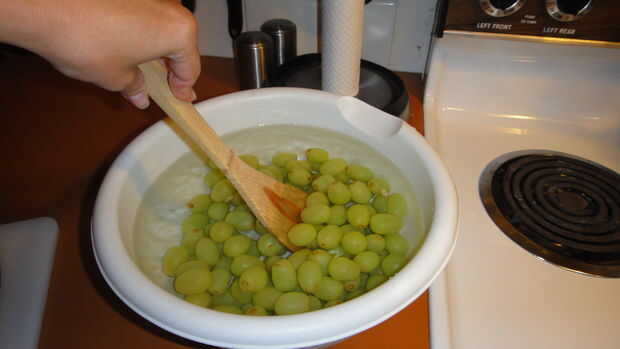 Transferencia de uvas blanqueados a tazón de fuente de agua fría. Asegúrese de que el agua cubre completamente la uva. Exprimir el jugo de 1/2 limón en el agua (puede utilizar una cucharadita de ácido cítrico pero me gusta el sutil sabor del limón en el producto acabado).