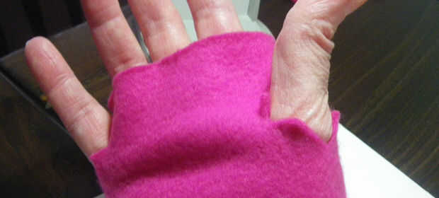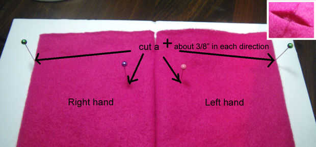 En el opuesto lado doblez, 1 3/4" abajo del borde y 3/4" en de la tapa, corta otro + para el pulgar. Ajuste los cortes de manera que los agujeros son lo suficientemente grandes como para cómodamente el dedo pulgar y el meñique.