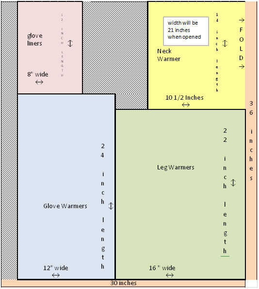 Los calentadores de la pierna va ser 16" de ancho y longitud de 22" y tendrá 2 de estos