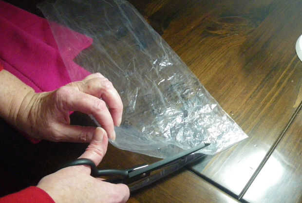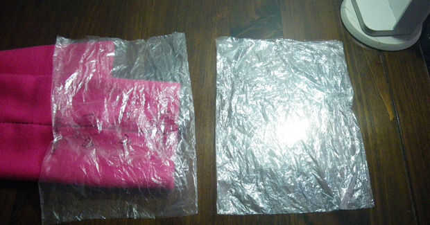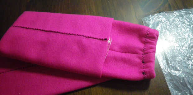 7 c) Coloque un tubo en el glover calentador aproximadamente 4" de la cubierta elástica. Ahora doble la parte inferior de la glover caliente, sobre la bolsa de plástico para que el plástico es capas entre las capas del paño grueso y suave.