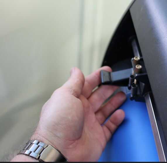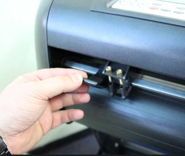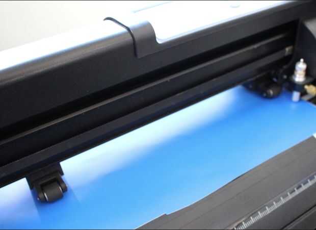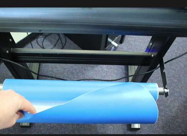 Configuración de la máquina es simple, sólo encender, tire de la manija en la parte posterior y colocar el vinilo. No olvide bajar la manija hacia abajo otra vez para bloquear las ruedas en el lugar