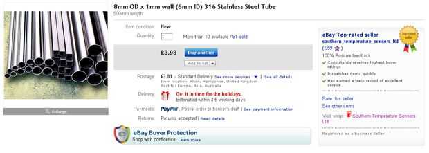 Tubo de metal - compré un pedazo de varilla de acero inoxidable de 8 mm od (diámetro) exterior 6 mm id (diámetro interno) otra vez de eBay pero también es posible conseguirlo de DIY y modelo/tiendas de artesanía. La tubería debe tener un diámetro interior que es sólo lo suficientemente grande como para caber sobre el eje de los controles en la cocina