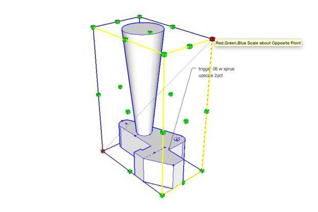 Escalando la parte al 2% a lo largo de los ejes creará un aumento de volumen de aproximadamente el 6% (1.02 ^ 3 = ~ 1.06). Esto compensa la contracción que sufrirá la parte metálica como el metal se enfría de ~ 230 a temperatura ambiente.