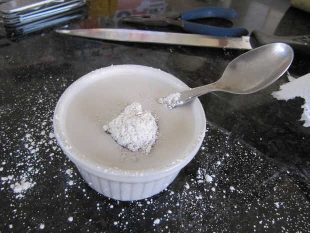 Para mezclar el yeso de París medida cuánta agua se necesita para llenar la caja, que es la cantidad de agua se debe utilizar. Agregar el yeso al agua un poco a la vez y revolver hasta que se forme pequeñas islas. debe ser la consistencia de pintura espesa.