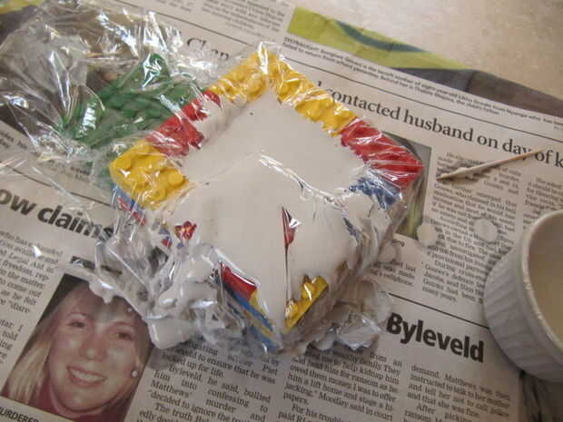 Cubrir el caja/recipiente con el plástico envoltorio como esto hará que sea más fácil de quitar. Hará también una caja de Lego resistente al agua y mantenerla limpia. Tuve un problema en conseguir el abrigo en la caja y este muestra en el molde. Es mejor si encuentras una manera pulsada la envoltura.