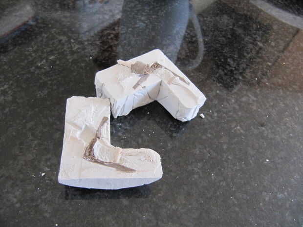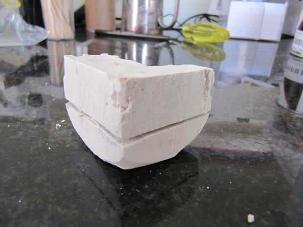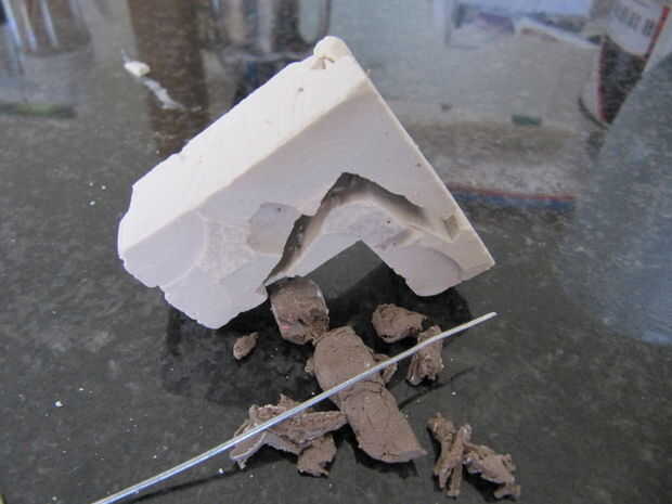 Utilice un trozo de alambre o una pequeña herramienta para raspar hacia fuera de la arcilla. Tenga cuidado de no dañar el molde aunque. Puesto que el pedazo de plastilina estaba descansando en la parte inferior de la caja había un agujero en la parte inferior del molde. Se rompió en dos una mitad y la otra mitad tenía un agujero en él donde la pared estaba delgada.