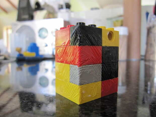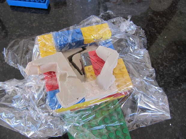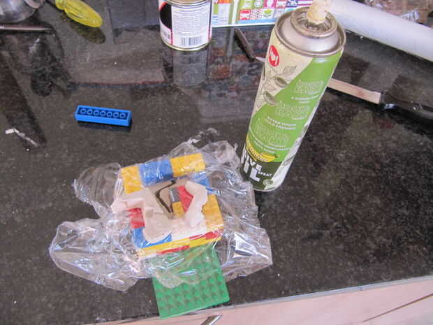 Otra vez forrado la caja con el plástico para dejar que se pegue y lío. Esto fue un error. El solvente de la resina había empapada por el plástico y comenzó a comer en el lego, como en la última foto. En el futuro voy a usar papel de aluminio.