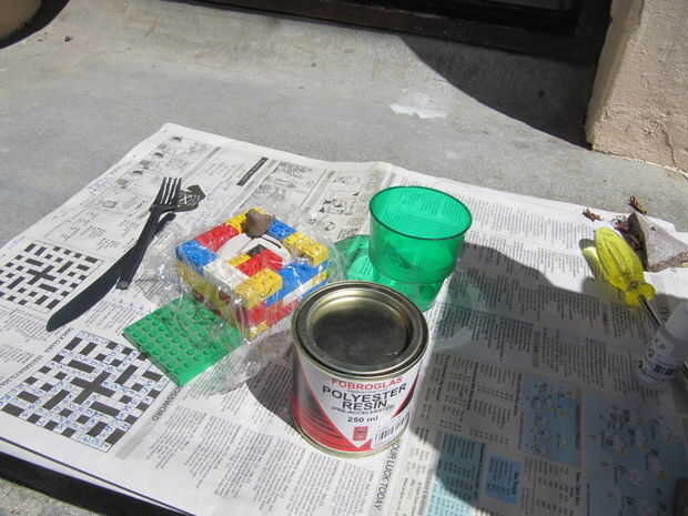 Mezclé a 25ml de resina con cinco gotas de endurecedor en un vaso desechable. Tardaron horas para curar así que creo que necesito más endurecedor. 25ml era demasiado así que hice un molde pobre de ladrillo de lego.
