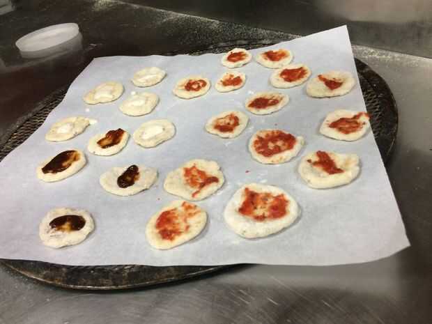 Después de pulsar hacia fuera como muchas de las pequeñas bolas de masa como, comienzan a añadir la salsa. Con una cuchara, dab pequeñas cantidades de rojo de la salsa en el centro de las pieles. Personalmente no me gusta demasiado salsa asi que utilizar lo menos posible por lo que no es abrumadora. Si te sientes arriesgado, probar algunas otras salsas como salsa Alfredo o salsa BBQ para hacer algunos combos más interesantes.