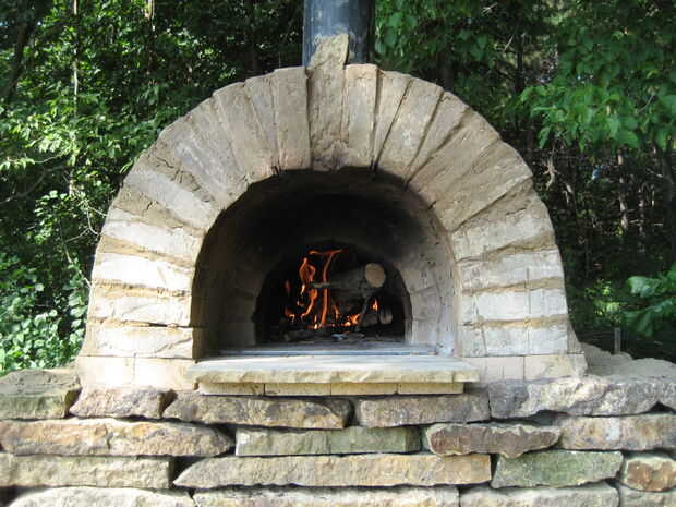 tengo fuego en el horno durante unas dos horas para levantarse a temp: dispararlo hasta el hollín quema el techo, luego por sobre otra media hora, y luego está lo suficientemente caliente como para pizza--en algún lugar por encima de 800 grados. Empuje el carbón apagado al lado con un látigo de las malas hierbas, luego Trapee el piso expuesto con un trapo húmedo que envuelve el azote de las malas hierbas. Entonces estamos listos para hornear.