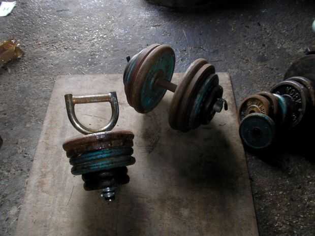 En primer lugar, saqué aparte una vieja mancuerna fija y un kettlebell caseros que raramente utilizado, para recuperar cuatro placas de 2.5kg (los negros). La única razón para este paso en el instructable es mostrar una imagen más bonita y quizás presente la idea de las pesas rusas si no has encontrado antes. Básicamente es sólo el extremo de una barra de curl de tríceps/martillo, aserrado apagado, y las placas aseguraron en el extremo con un par de manguera abrazaderas. La barra fue rellenada con caucho de llanta de bicicleta para que las placas y abrazaderas, lo agarre mejor.