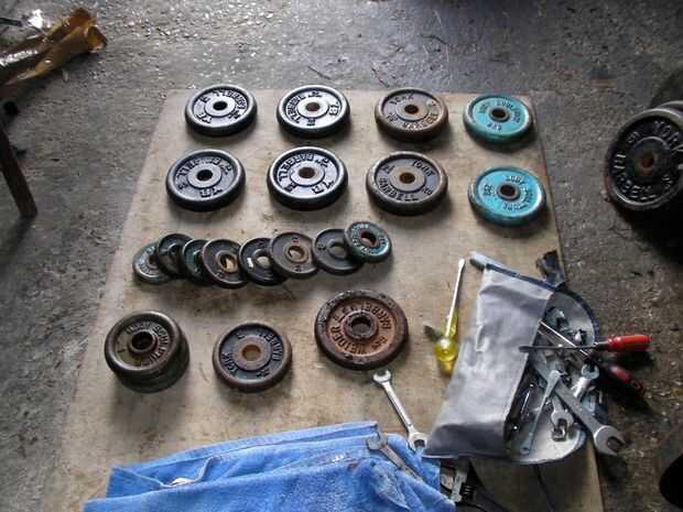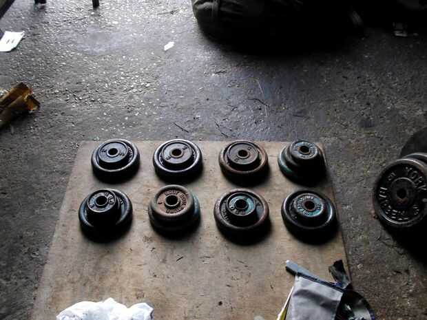 Las placas a lo largo de la parte superior son seis 2.5 kg (negro) y 2 kg (azul). Además, he encontrado ocho placas de 0,5 kg, junto con algunos otros. Esto es mucho - incluso si usted tenía solamente cuatro placas de 2,5 kg, usted podría hacer un par de 5kg placas olímpicas, que es sin duda todavía útiles.