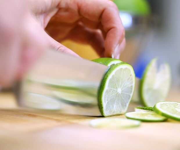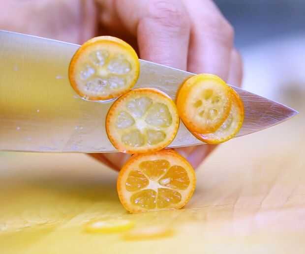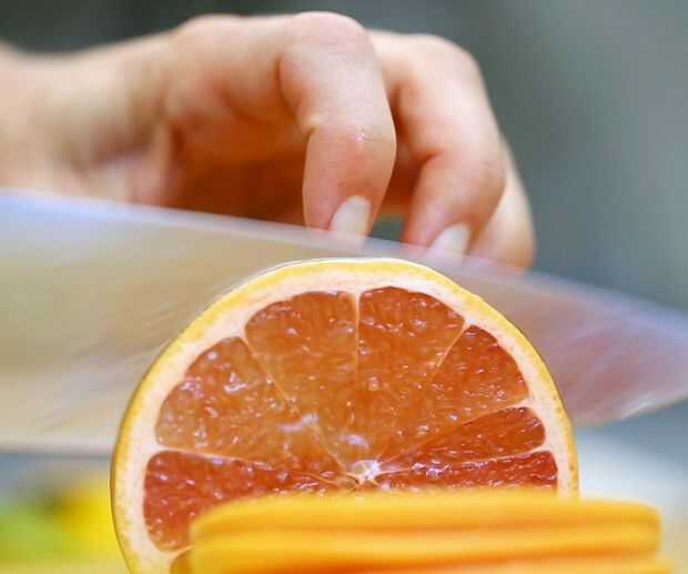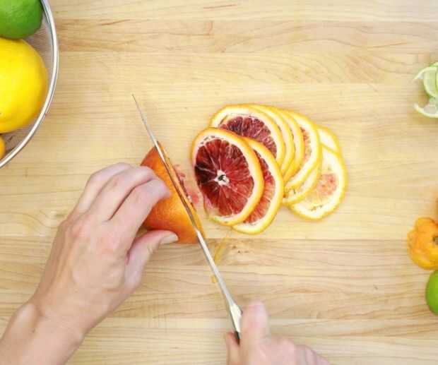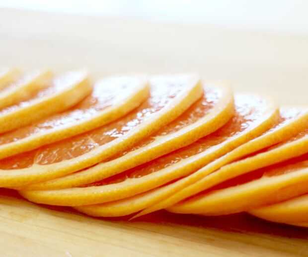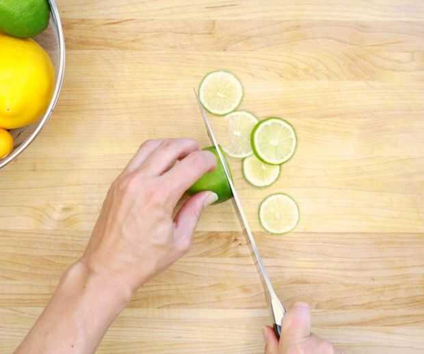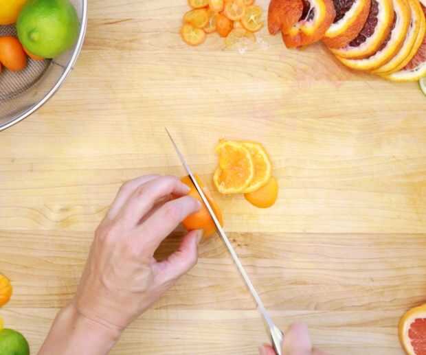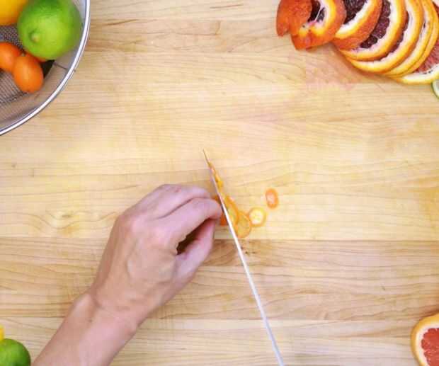 Usando una mandolina o un cuchillo de chef filoso, cortar la fruta tan finamente como sea posible.