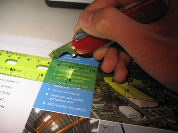 Suavemente usando una regla y una navaja de bolsillo, cuenta a lo largo de la línea que dibujó para que se puede doblar más fácilmente el papel. Luego, doblar a lo largo de las líneas anotadas. Aviso que estoy usando el destornillador plano para marcar el papel y no el cuchillo para que no dañe demasiado el papel.