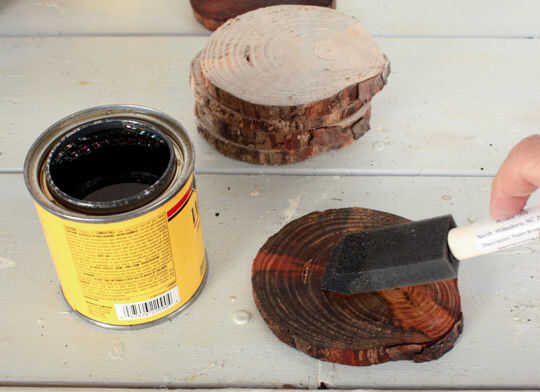 Con un cepillo de espuma, agregar tinta para madera a la superficie de arena y alrededor de los bordes de las rebanadas.