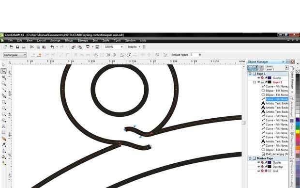 Una vez conectada la línea trasera al principio ir a la parte superior de la barra de herramientas y haga clic en seleccionar todos los nodos. Se verá como tres puntos. Cuando usted ha hecho clic en esto, vaya a la izquierda y haga clic en la línea de convertir a la opción curva, es una curva con una flecha en cada extremo. Ahora, usando la herramienta de forma de la izquierda se puede manipular la línea sobre las vueltas de la imagen. Este será el proceso a lo largo de esta etapa.