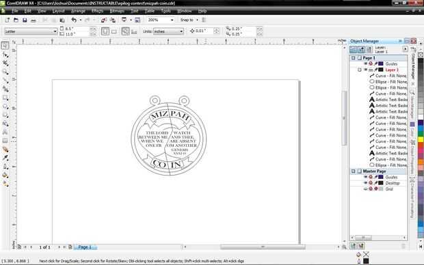 A continuación usando eclipse herramienta haga un círculo a un lado de la moneda (porque la moneda se divide en la imagen que sólo puede trabajar de un lado a la vez). Asegúrese que el ancho de línea es 0.0069, hacer esto pulsando F12 y cambiar la configuración de ancho, hacer esto para todas las líneas que hace. Ahora copia y pega este círculo y reducirlo para ajustar el círculo. Ahora tienes la forma de moneda. Recuerde el trabajo por un lado la selección todo lo que han dibujado y pasar a alinearse con el otro lado.