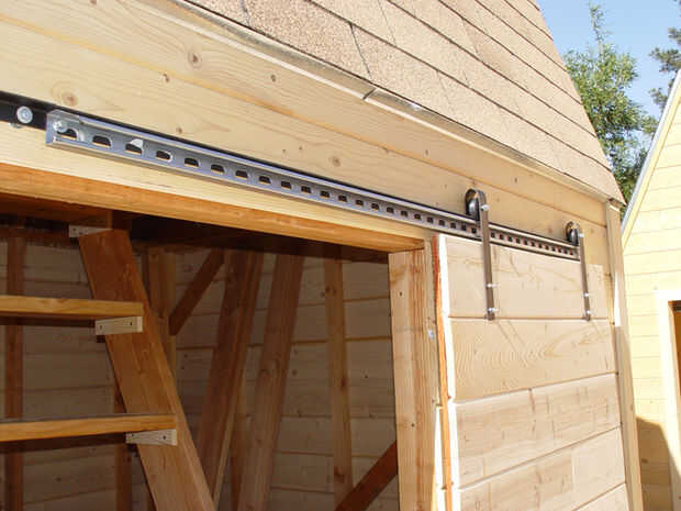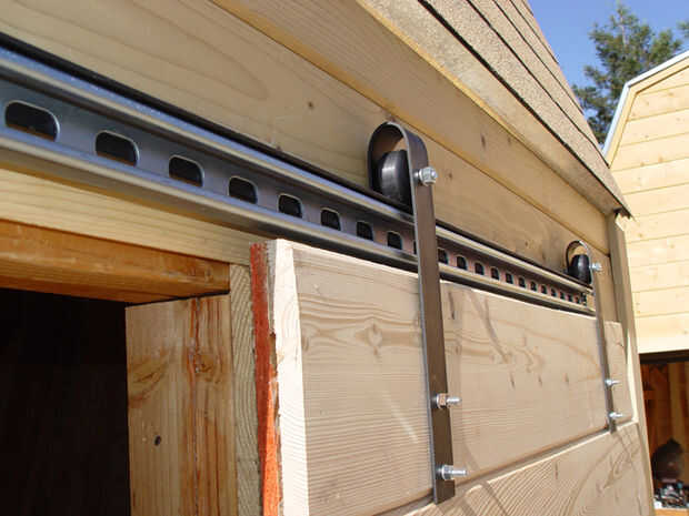 Coloque la puerta de la derecha en la abertura de la puerta y temporalmente amarrarla o pídale a alguien que mantenga en su lugar para que quede centrado en la abertura de la puerta. Deslice dos rodillos/perchas sobre la barandilla Superstrut y coloque cerca de los lados izquierdo y derecho de la puerta, asegurándose que estén ubicados en una porción sólida de la puerta. Marque y perfore agujeros de 1/4" a través de la puerta para que coincida con los orificios inferiores de dos de cada percha. Luego fije la puerta a los soportes con tornillos de 1/4" y tuercas.