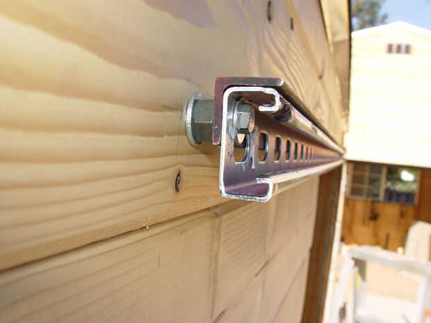 Ajustar el ángulo de hierro en la parte superior la Superstrut y marque el ángulo de hierro en el centro del orificio de la Superstrut. Perfore un agujero de 3/8" a través del hierro de ángulo. Luego con un ayudante sujeta la Superstrut justo por encima de la línea que trazaste anteriormente, marque y perfore agujeros en el edificio para los tirafondos. Si hay n stud directamente detrás de este agujero, usted necesitará cortar y un soporte de 2 x 4 entre los postes existentes, directamente detrás del orificio del clavo. El tornillo necesita una base muy sólida para el montaje. A continuación monte la Superstrut y el ángulo de hierro y atornillarlos a la pared como se muestra en la foto.