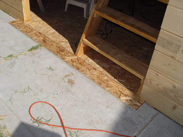 Para colgar de la barandilla, primero coloque a un espaciador temporal cerca de ½" de grueso debajo de la abertura de la puerta. Su puerta en la parte superior este espaciador y marque la altura del borde superior de la puerta (no he cubierto la puerta o la construcción de la puerta en este Instructable). Hacer una segunda marca ½" por encima de esta primera marca. Con un nivel de carpintero, utilice este marcador superior para dibujar una línea que extiende 6' a cada lado del centro de la abertura de la puerta. La línea debe ser 12 pies de largo totales. Si usted está haciendo su puerta más ancha o más estrecha que el 6' abertura de la puerta ancho utilizado para este edificio, Ayuste le rail.