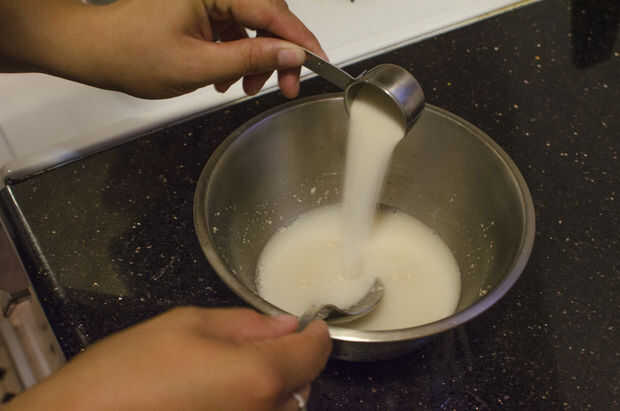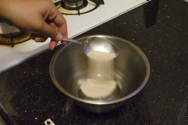 Mezclar la levadura y el agua tibia en un bol. Disolver la levadura revolviendo en el agua. Luego, revuelva el azúcar a la mezcla de levadura y agua.