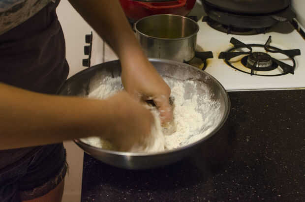 Mezclar la sal y la harina en un tazón grande. Vierta los ingredientes húmedos a los ingredientes secos y empezar a incorporar con la mano. Todo trabajo de la harina en la masa. Si la masa está demasiado seca más incorporar la harina, agregar agua una cucharada a la vez hasta que la masa se vuelve más realizable. Si su masa es demasiado pegajosa bien amasar, añadir la harina una cucharada a la vez hasta que alcance la consistencia adecuada. La masa estará un poco pegajosa pero no debe ser tan pegajosa que no puede trabajar con él.