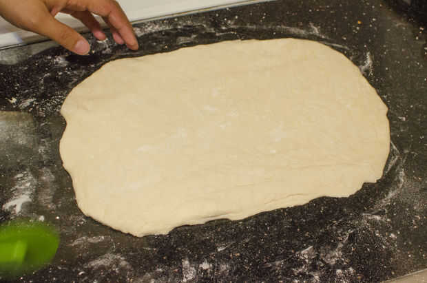 Ligeramente la superficie de trabajo la harina y comenzar a rodar la masa con un rodillo. La masa debe ser aproximadamente 1/4 de pulgada de grosor. Formar la masa en forma rectangular áspera.