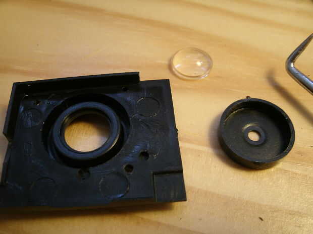 6. puesto que el disco de apertura modificada ya no tendrá el lente correctamente, aplicar masilla de plástico un poco al frente de la Junta de la lente y presionar el lente en su lugar. Retire el exceso de masilla.
