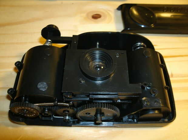 6. una vez que la placa frontal está apagado, la puerta trasera de la película se levanta derecho. La correa de muñeca y el mecanismo de cierre de puerta trasera caerá en este punto.
