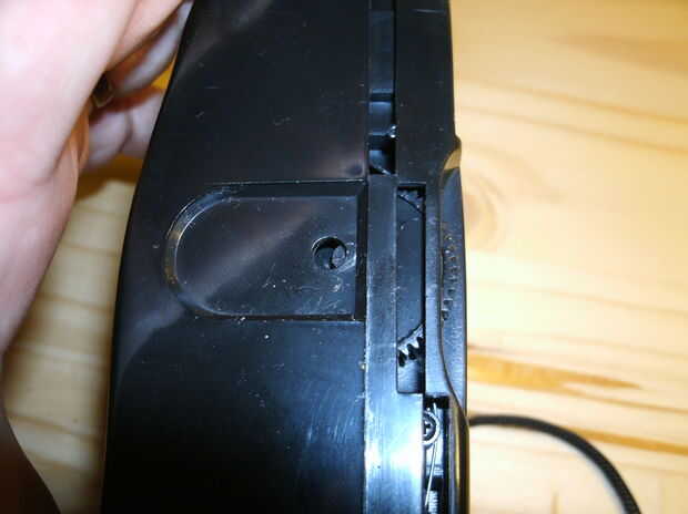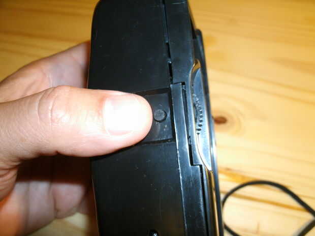 5. Oprima este botón mientras tira la placa frontal. Que tenga que doblar el plástico de la placa frontal ligeramente para obtener sobre el botón de rebobinado.