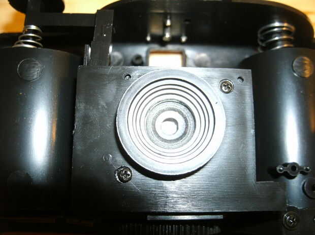 7. Busque en la parte delantera de la cámara y coloque el montaje de la lente. Se adjunta a la cámara con 2 tornillos. Retirarlos y levante el montaje de la lente.