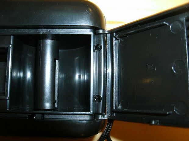 1. Abra la puerta trasera de la cámara y localice los tornillos cerca de la bisagra de la placa. Estos están empotrados por lo que necesita un fino destornillador phillips. Retire estos tornillos.