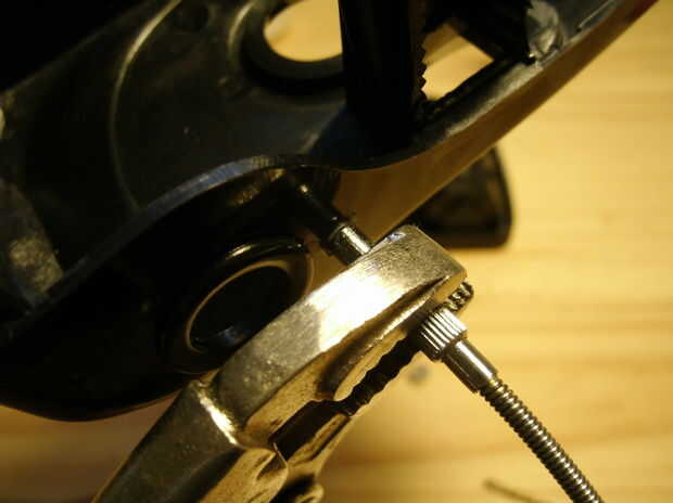 3. una vez que se perfora su agujero, atornille en la versión de cable en el orificio para cortar hilos de rosca en el plástico suave. Una vez en los dedos, acabado con un par de pinzas.