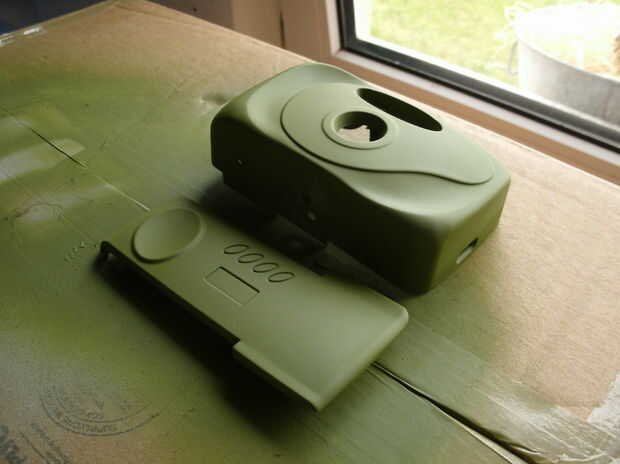 Moldeo por inyección deja la cámara momentos demasiado brillante y plasticky mirando. Me decidí a pintar la mayoría de la cámara para darle una mejor sensación. La única pintura que llevaba en la mano era verde, así que ahí ir!