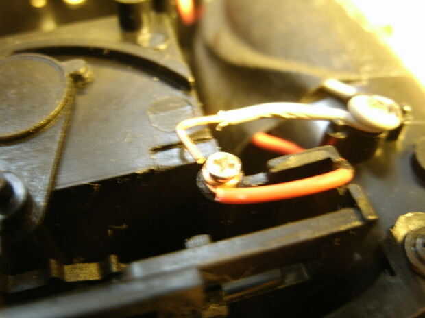 7. ruta del hilo de contacto en el electrodo central de la zapata. Idealmente, sería soldar estos cables en, pero hay demasiado plástico aquí para eso. Pegué el cable en con algun pegamento conductivo.