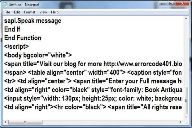 Paso 1: Abrir Bloc de notasAbrir Bloc de notas en tu windows xp, windows 7 o windows 8 computadoras.Paso 2: El código Escribe esto en Bloc de notas:Dim texto, sapitexto = inputbox ("Introduzca el texto para ser hablado")Set sapi=Createobject(&qu