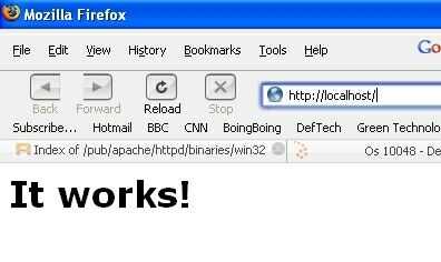 Probarlo, cuando estás seguro de que está ejecutando el servidor abrir un navegador y teclear: http://localhost en la barra de direcciones, esto debe aparecer (ver foto).