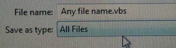 A continuación elija cualquier nombre de archivo pero asegúrese de poner .vbs luego. Ej.: Filename.vbs