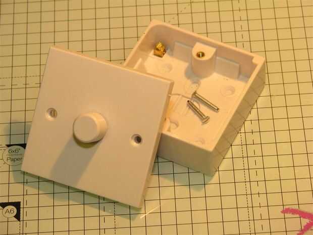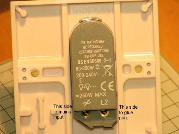 Usted también necesitará un barato interruptor dimmer luz (£5, $8) que puede obtener de cualquier departamento eléctrico de tienda de bricolaje. Como de baja potencia como sea posible; 250W es mucho más que suficiente. Mi pistola de pegamento es de 35W y el regulador corta aproximadamente 1/5 de viaje que es probablemente debido a que es por debajo del mínimo (60W nominal). No es un problema ya que esto es por debajo del punto de fusión del pegamento.