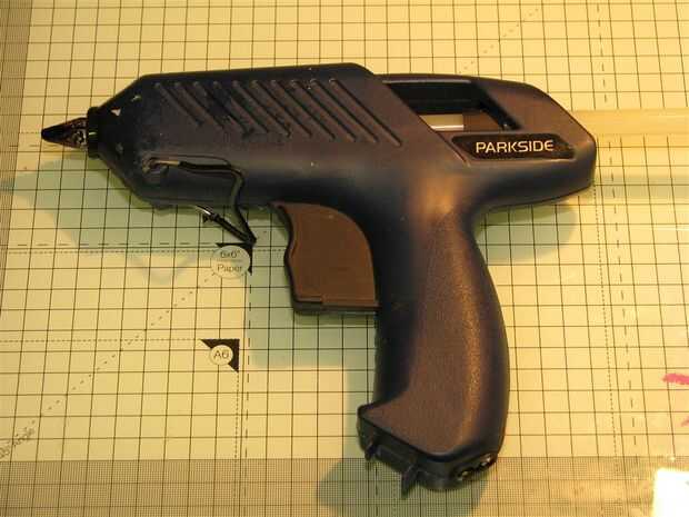 A menos que tengas un particularmente largo cable de alimentación de la pistola encoladora, tendrá una longitud de cable de red con un enchufe en el extremo. Encontrará una alrededor de la casa en algún lugar, probablemente conectada a un aparato obsoleto. Debe ser no más delgado que el cable de la pistola de pegamento.