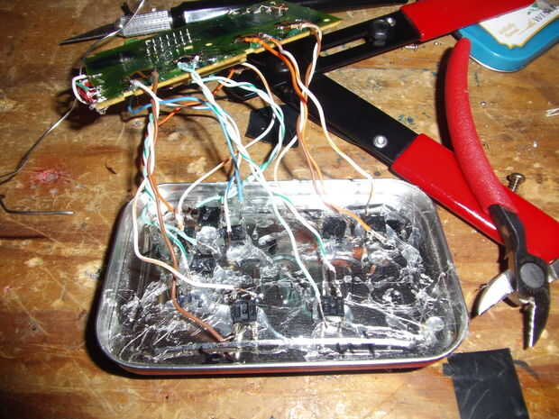 esta parte se ve duro-a pero si lo haces por botón entonces será muy fácil. primero conectar los botones dpad es el más fácil en mi opinión. sólo tiene que conectar un botón a la vez, desde la junta al tacto. Asegúrese de que ejecutar los cables del interruptor derecho, que puede ser un poco confuso así que solo marque los botones en la tapa del altoid. después de soldar do un rápido vistazo para asegurar todas las conexiones son sólidos y no deseados no se hacen las conexiones.  (utiliza los cables diagonales de los interruptores de tacto para hacer las conexiones)