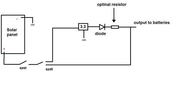 Bien, así que permite habla de lo que vemos aquí. primero apagado, me gustaría explicar la función del interruptor de spdt, este interruptor tiene dos posiciones, una posistion permite 5 volts para el regulador de 3.3 tensión (ajustar la tensión de acuerdo con las calificaciones de su batería), que posición debe usarse para cargar las baterías en el sol y la otra posición es lo que gusta llamar un bypass , simplemente omite el regulador y va directamente a las baterías, esta posición no se debe utilizar luz directa del sol porque los 5 voltios se van directamente a las baterías que en algunos casos pueden no ser buena. Este positons permite que las baterías a cargar en una habitación bien iluminada, donde no habrá tanta tensión de salida. Por ejemplo que posiblemente puede cargar las baterías mientras que en la iluminación normal de su hogar, mis salidas panel dos a 3 voltios cuando condiciones normales de iluminación que es perfecto para un sol no directo luz chagre, recomiendo probar las diferentes salidas antes de poner todo junto. realmente no es necesario el spdt pero me gusta porque ofrece un poco de variedad. Ahora me explico la función de diodos, desempeña un papel muy importante, no deja las baterías de la descarga en el panel solar que podría ser perjudicial para el panel, supongo que podría ir con hacia fuera pero yo recomiendo usar uno. Ahora que me explique la resistencia (me di cuenta de escribe mal en el esquema lo siento sobre eso), la resistencia no pudo ser necesaria en tu caso, pero me sentí era necesario porque las baterías en serie son 2,4 voltios (1.2 por ellos mismos) y quería llegar lo más cerca que pude a esa categoría y con la resistencia trajo el voltaje hasta 2,7 voltios que es casi perfecto. por lo tanto la resistencia cayó 3.3 a 2.7. La resistencia no pudo ser necesaria en su caso, todo depende de tus calificaciones de batería que usted debe saber antes de empezar esto.